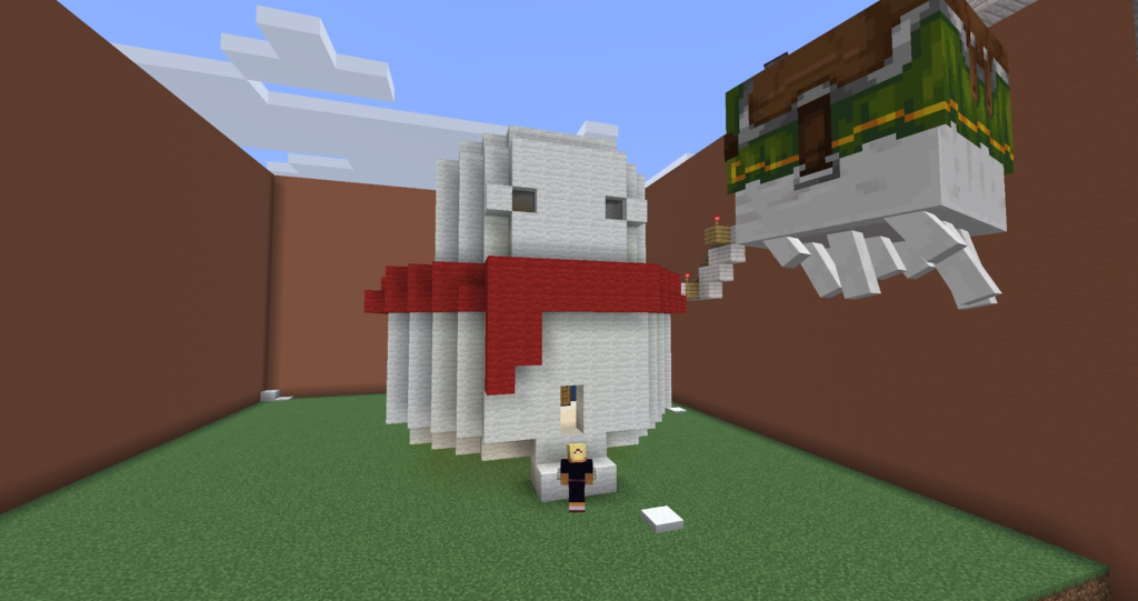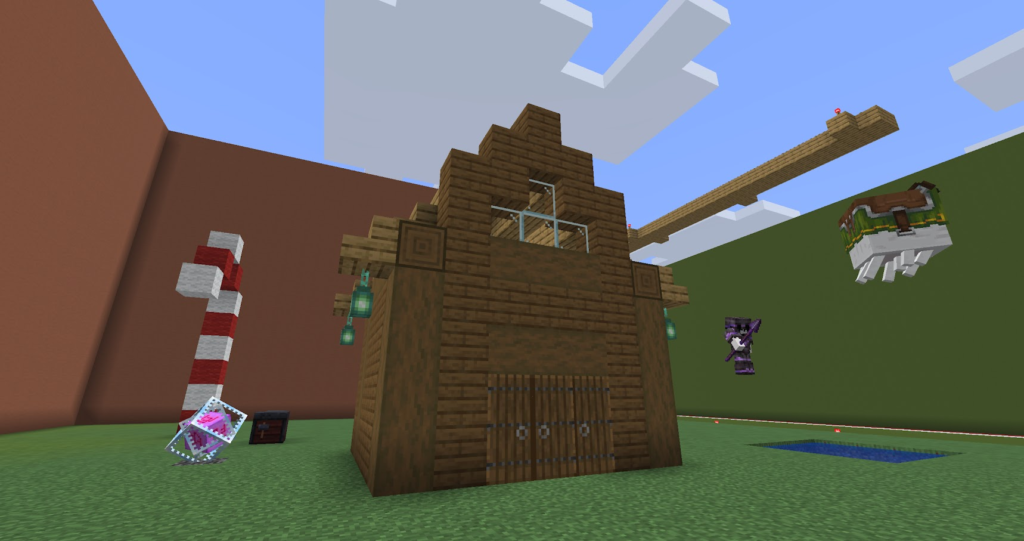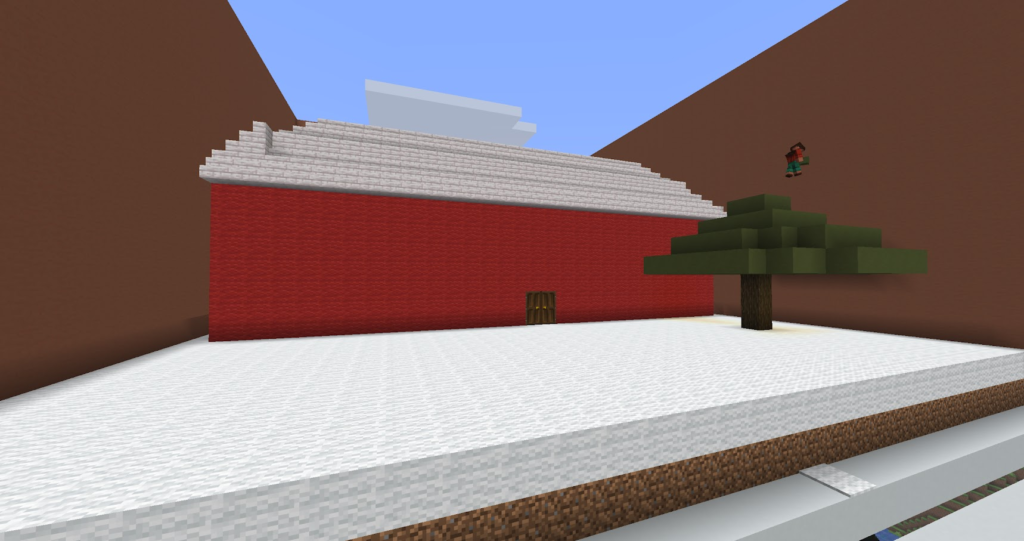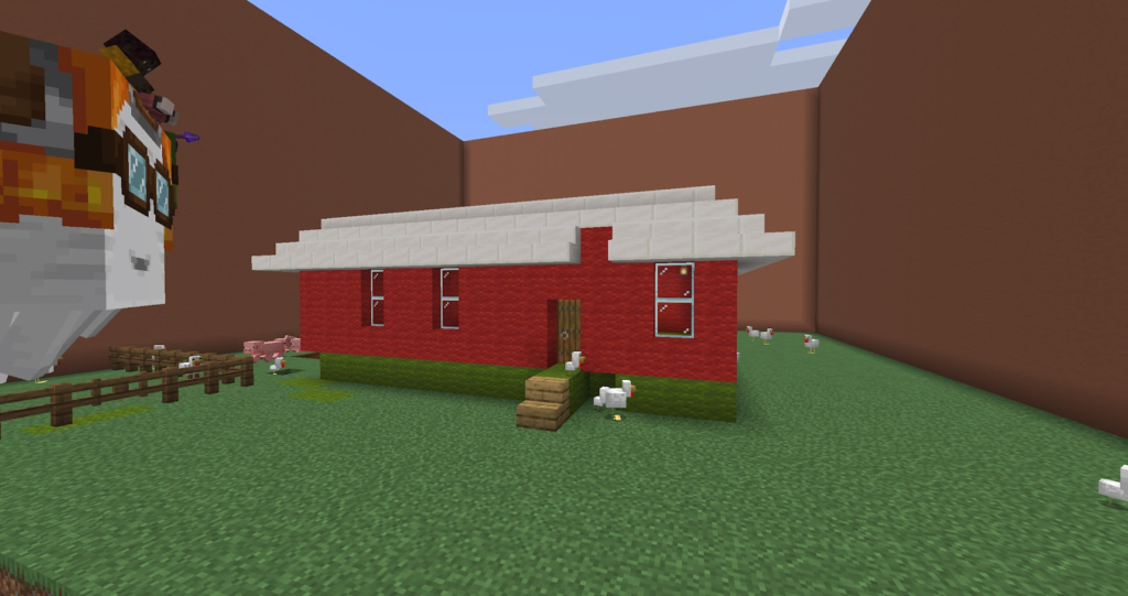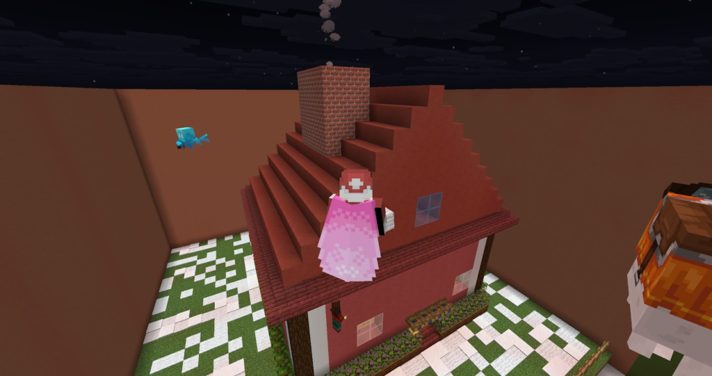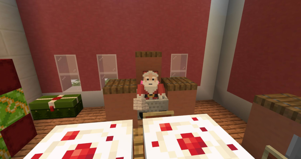 丁寧に作った三角屋根のおうちです。マイクラでは斜めの屋根は意外と大変。サンタコスチュームの先生が案内してくれます。