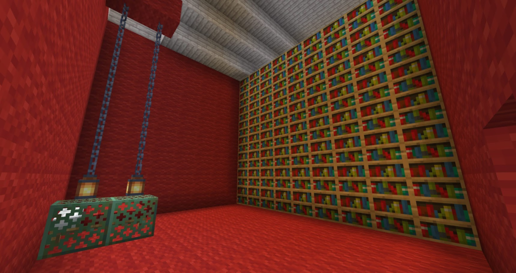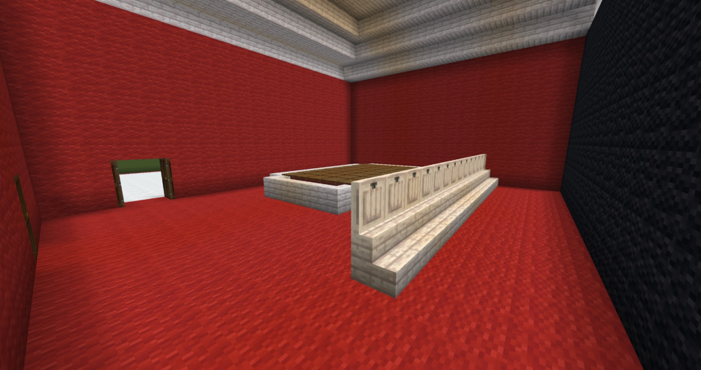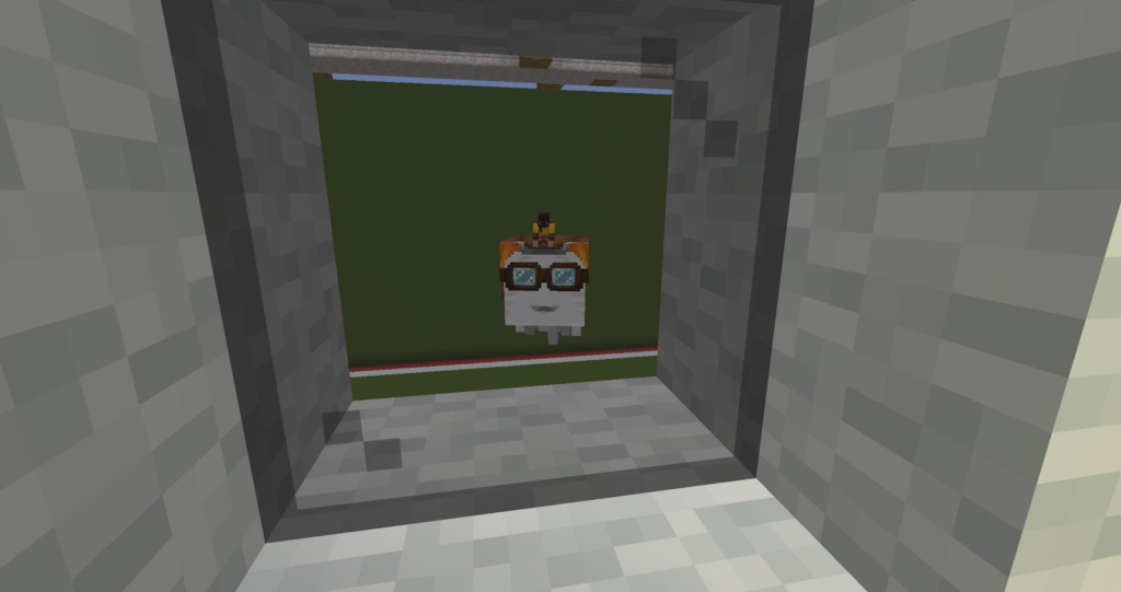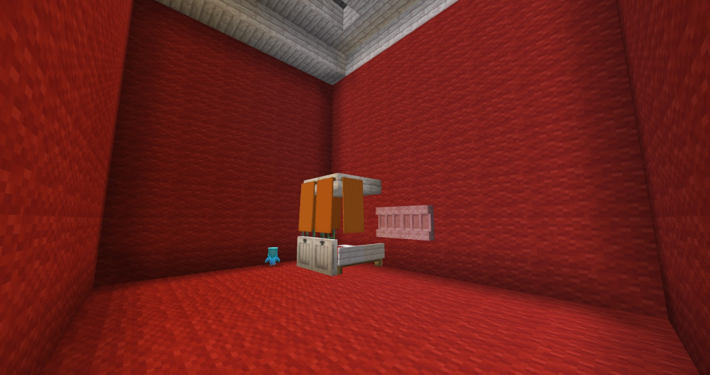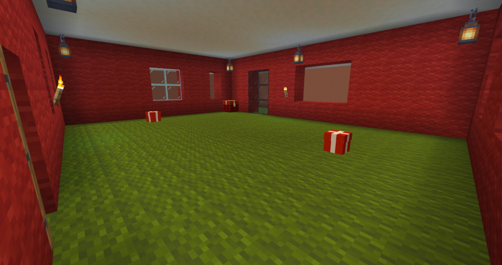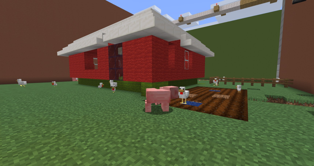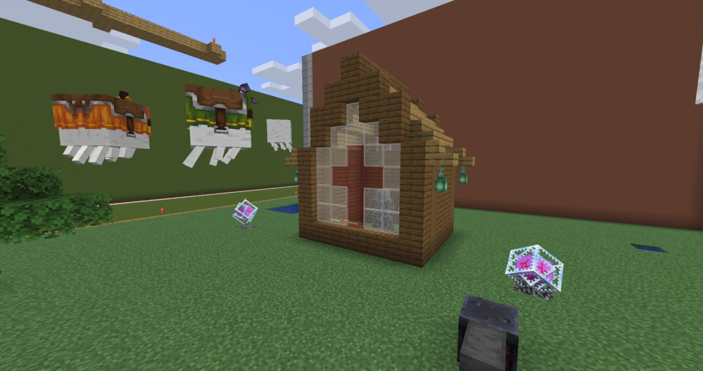 丁寧に作った三角屋根のおうちです。マイクラでは斜めの屋根は意外と大変。サンタコスチュームの先生が案内してくれます。